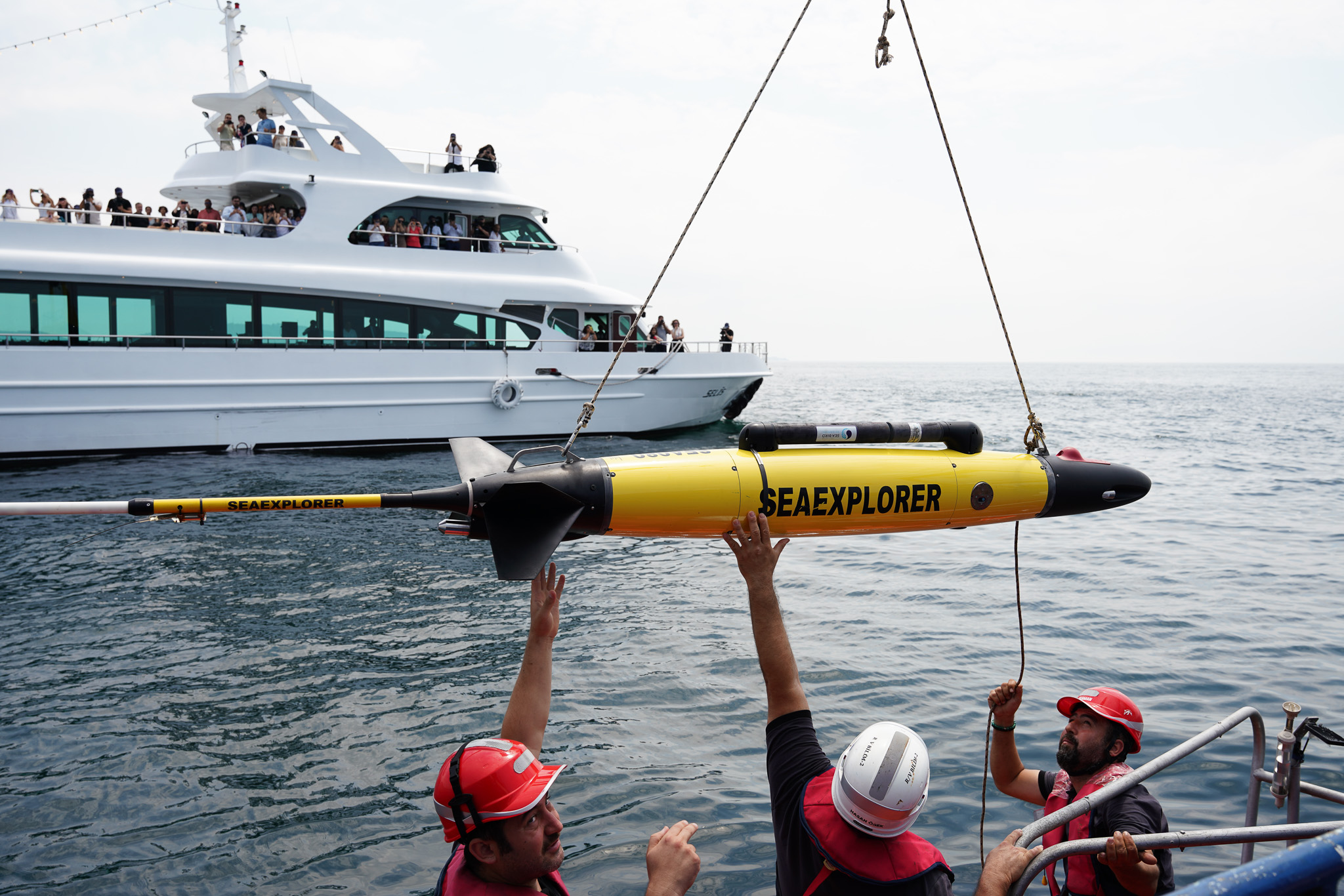 ‘Deniz Kâşifi’ isimli insansız su altı planörü Marmara Deniz’i açıklarında suya bırakılırken